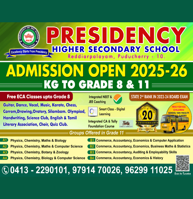 At Presidency Higher Secondary School, we believe that education is not merely preparation for life—it is life itself. Our mission is to empower young minds with knowledge, discipline, and strong values that guide them throughout their journey. We are committed to providing a learning environment where every child is inspired to explore, question, and excel.