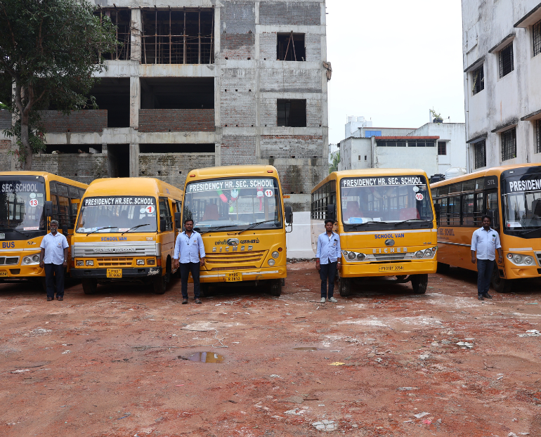 Safe and reliable school transport is provided for students. KG students receive transport free of cost, with trained drivers and helpers ensuring secure pickup and drop.